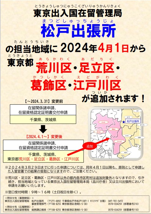 【お知らせ】松戸出張所の担当地域拡大について 2024/03/12 2024年4月1日から 東京出入国在留管理局 松戸出張所の担当地域に 東京都「荒川区・足立区・葛飾区・江戸川区」が追加されます! 出展:法務省ウェブサイト